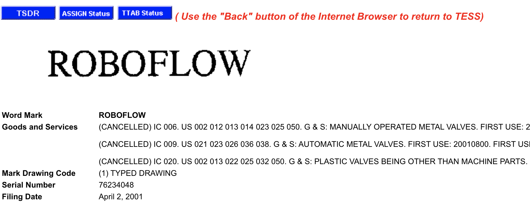 After some digging, we discovered that they had acquired a company called Robolux in 2005 that previously had a product called Roboflow. But, after the acquisition, it was discontinued and the trademark expired in 2009.