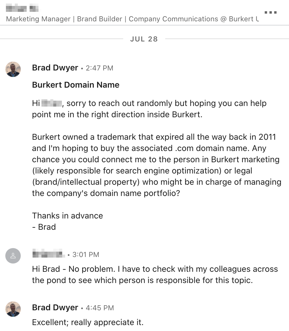 The next morning, I awoke to a reply in my inbox from the contact at Burkert. My heart skipped a beat and all of the sudden thoughts of million dollar price tags entered my head. There was no way, I thought, that we'd be able to afford the domain even if they were willing to sell.