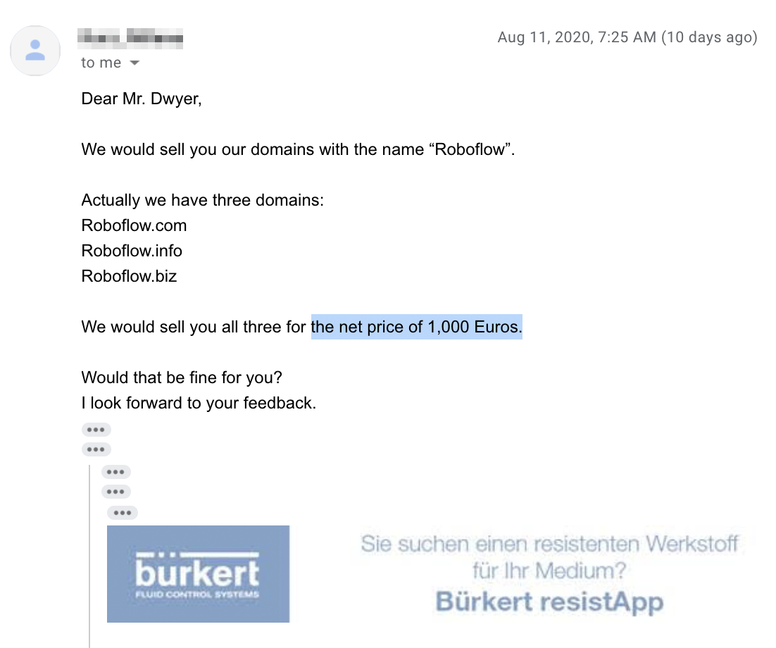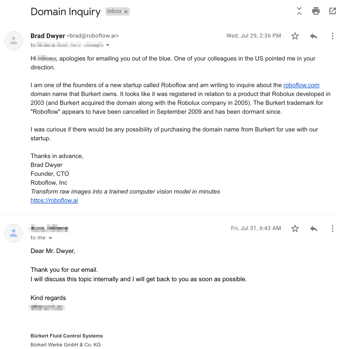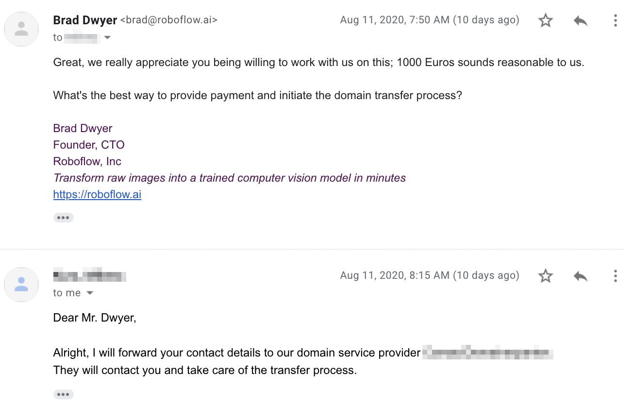 Things have been growing fast at Roboflow over the past few months so, earlier this summer, we decided it wouldn't hurt to start a conversation to buy the domain. We figured doing this before announcing any funding would be a good strategy so they wouldn't Google us and jack up the price.