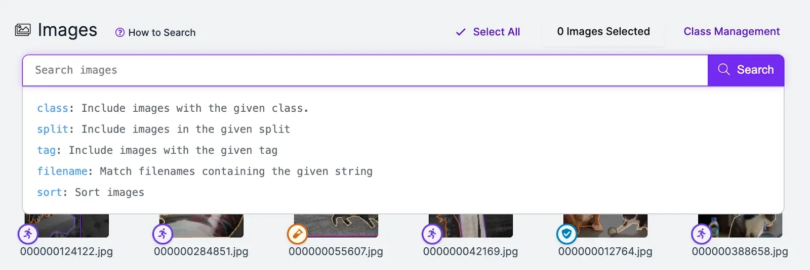 like-image:<SOURCE_ID>: Sort by semantic similarity measured by CLIP.tag: Filter by user-provided tags.filename: Runs a search for file names that match the provided file name. Use * at the beginning and end of a query to run a partial match.split: Filters by split (train, test, valid).job:<JOB_ID>: Shows images with the provided job ID.min-width:X: Shows images with a width less than X.max-width:X: Shows images with a width greater than X.min-height:X: Shows images with a height less than X.max-height:X: Shows images with a height greater than X.min-annotations:X: Filters images with more than the specified number of annotations.max-annotations:X: Shows images with fewer than the specified number of annotations.class:CLASS: Shows images that have at least one annotation with the provided label.-class:CLASS: Shows images that do not feature a particular class