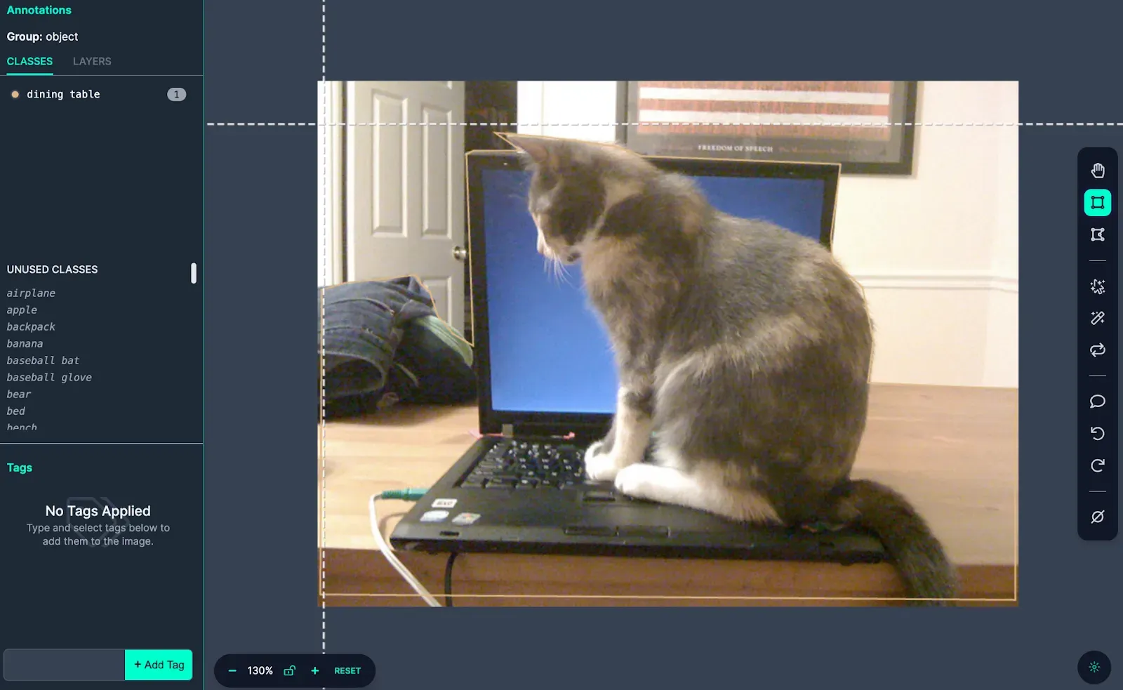 In this image, there is a “dining table” label but no label for the cat. An annotation was missed during the labeling process. We could fix the annotation and repeat this process for different classes to clean up the dataset.