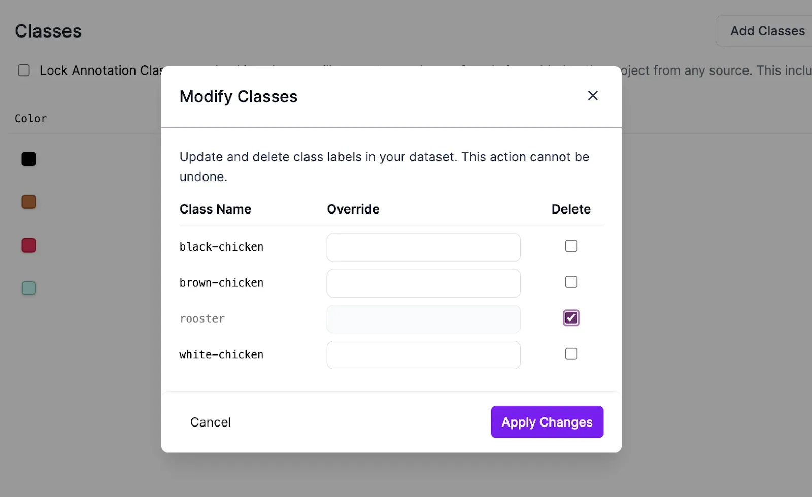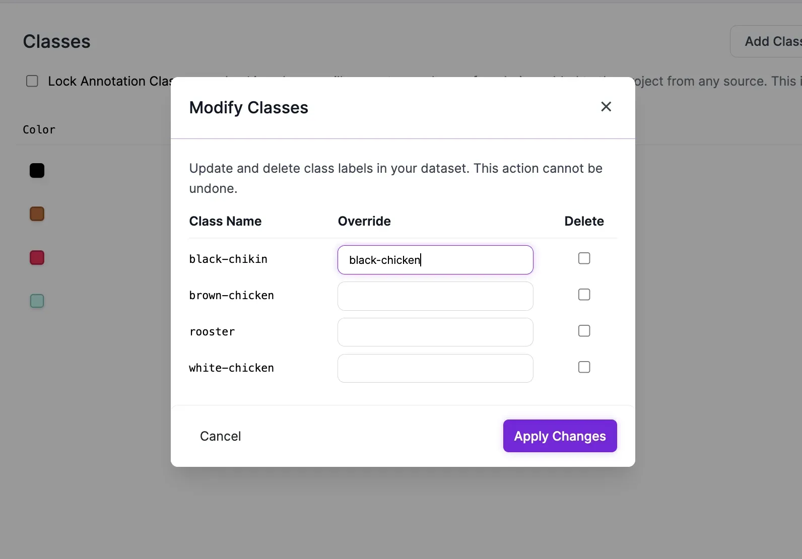 You can now manage all your classes from the class management page. This includes adding new classes after project creation, remapping and renaming classes, deleting unused or unneeded classes, and assigning custom colors to each class.