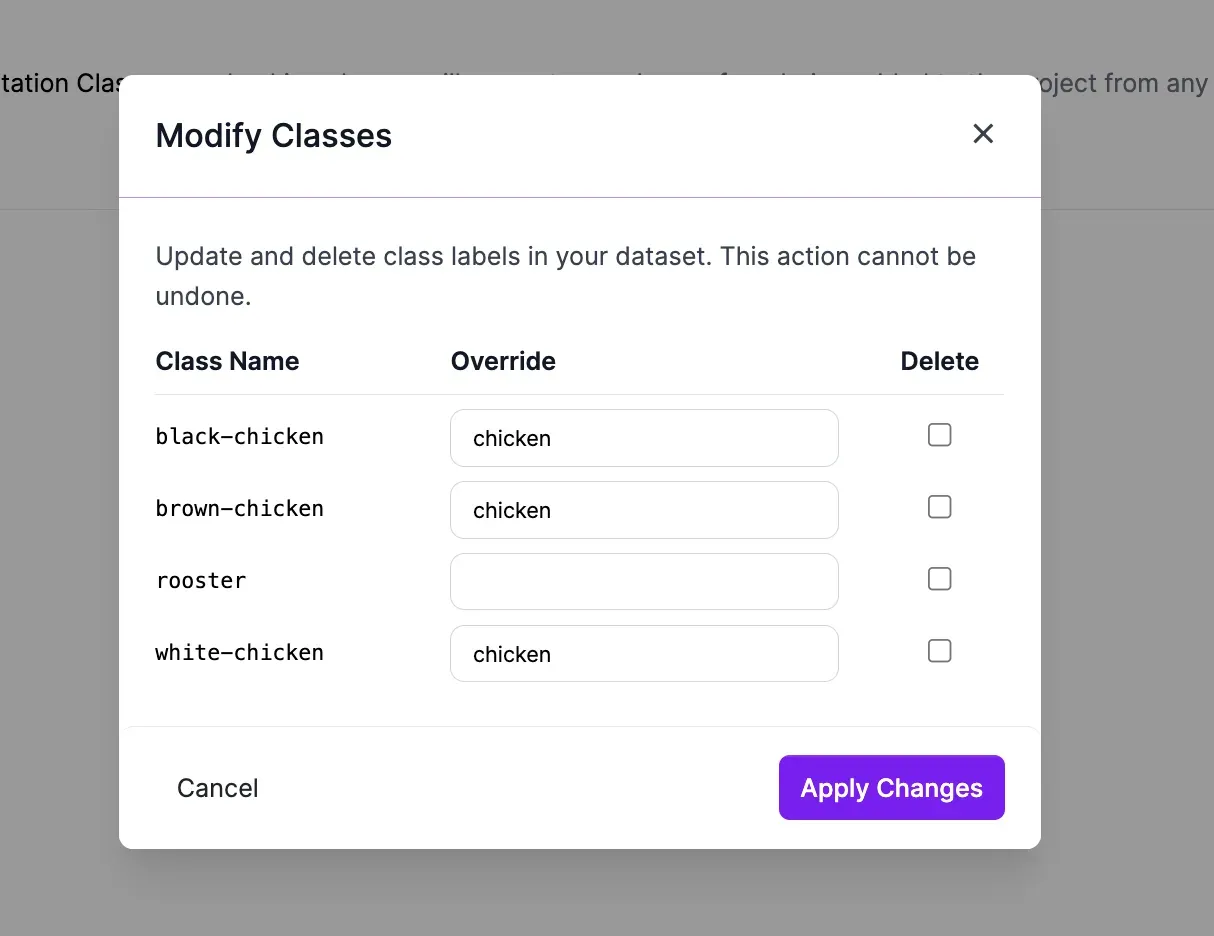 You may no longer need a class and may want to permanently delete it from the dataset. You can remove all instances of a class using the delete operation, which cannot be undone. If you’d like to experiment with excluding a class, you can exclude the class using the remap preprocessing step.