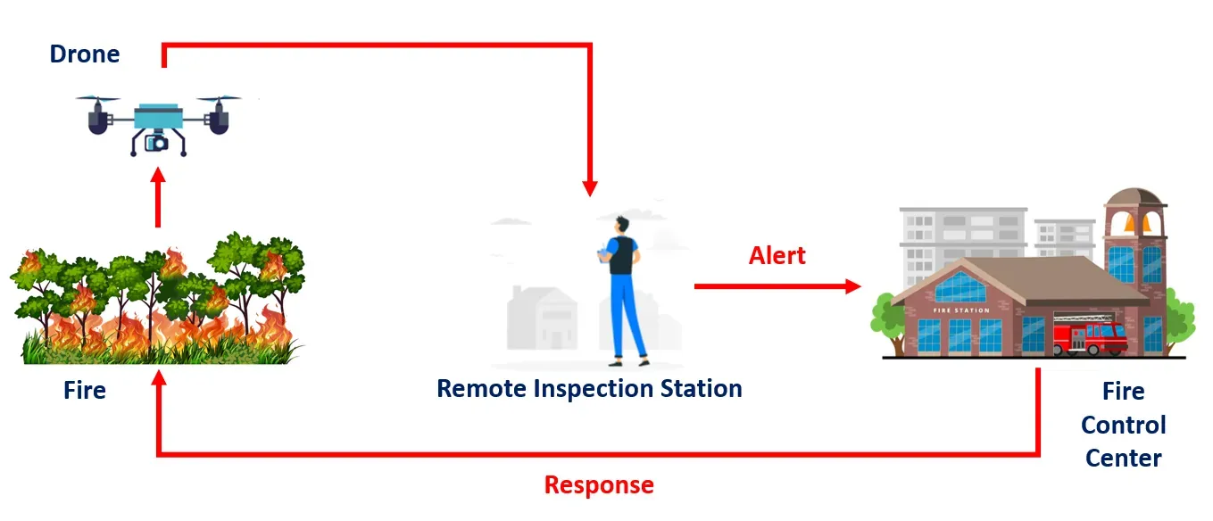 - Deployment of the Drone: The drone equipped with a camera module is deployed to the area that needs to be inspected for potential fire hazards. Drones are well-suited for this task as it can quickly cover large areas and can be accessed remotely.