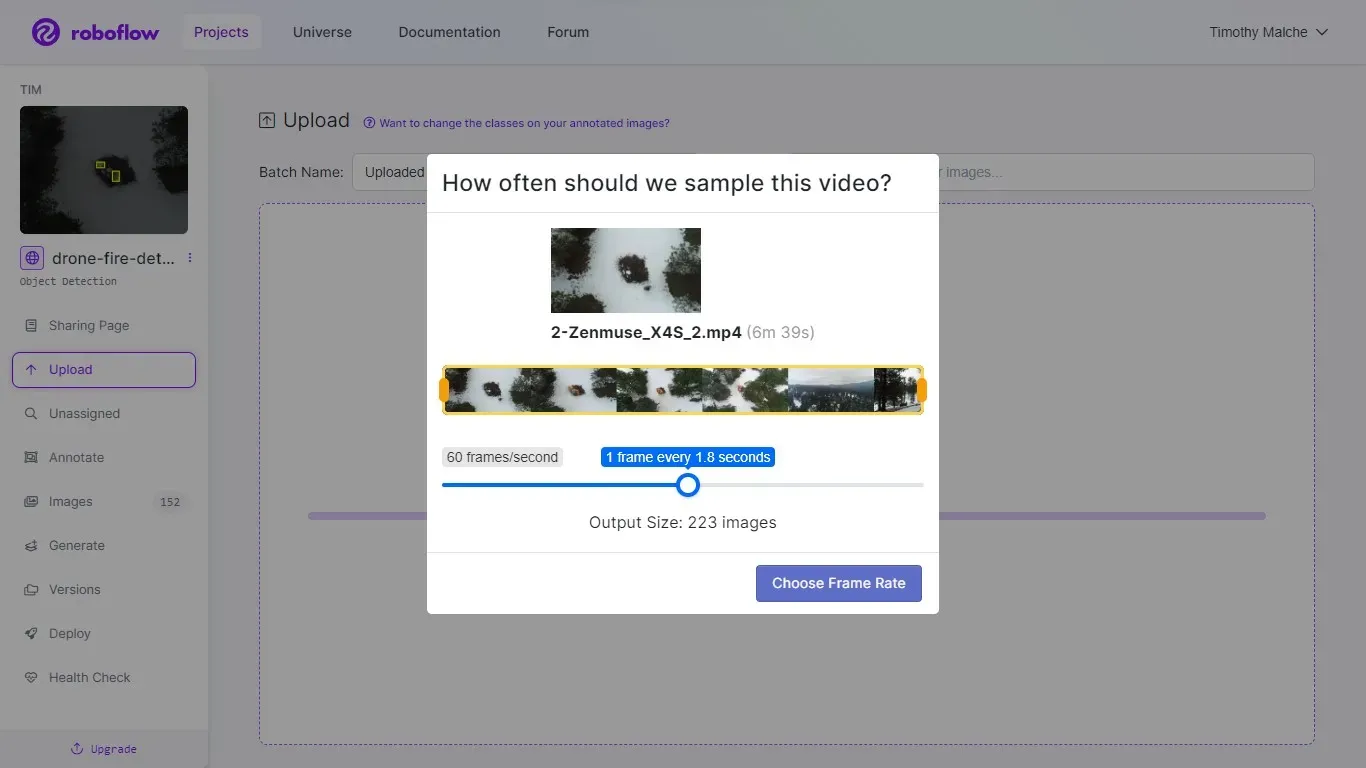 The dataset was first downloaded, then uploaded to our own Roboflow account. In the context of our fire detection project, the dataset is collected in video format (.mp4). Roboflow has a useful feature that enables users to effortlessly upload videos, subsequently automating the extraction of individual frames from the video and transforming them into distinct images.
