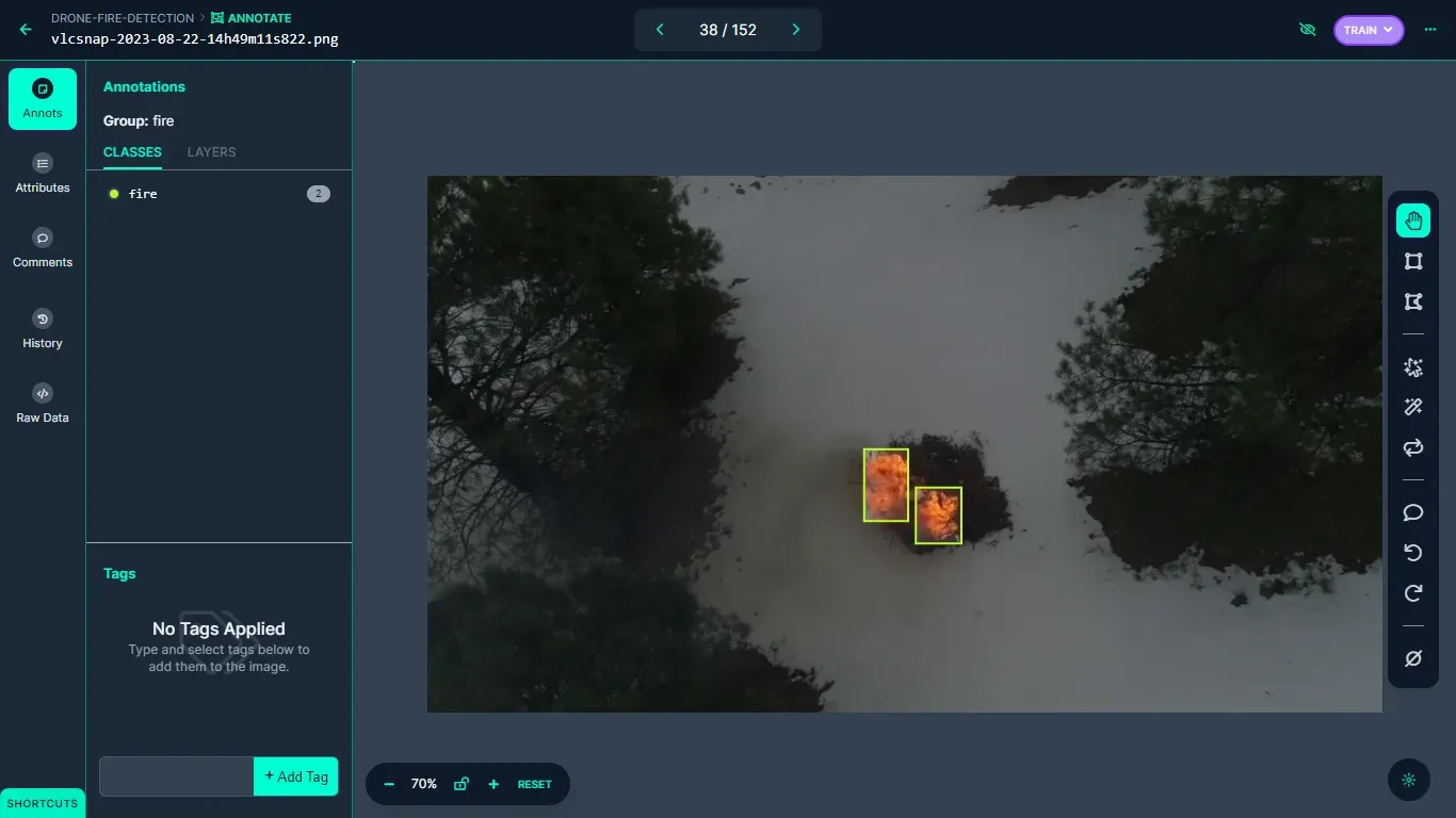 After images have been successfully uploaded, they can be annotated using Roboflow's annotation tool. In the context of this project, object detection bounding boxes are used to label these images. The label fire is used to annotate all occurrences of fire within the dataset. The labeling process is a critical step in preparing the dataset for training, as well as enabling the computer vision model to accurately identify and classify instances of fire within the images.