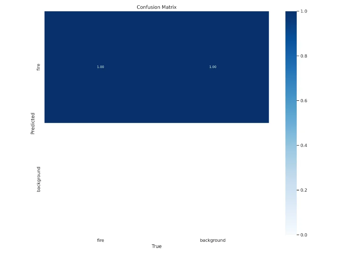 yolo task=detect mode=train model=yolov8m.pt data={dataset.location}/data.yaml epochs=50 imgsz=800 plots=TrueBelow, we can see how our model performs at detecting the `Fire` class. Our model achieves a 0.95% recall rate, a 0.99% mAP50 score, and a 0.63% mAP50-95.