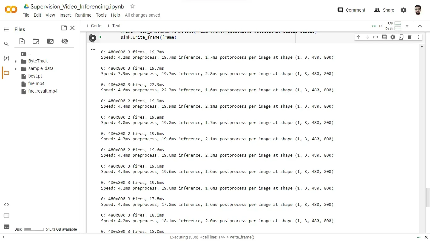A loop iterates through the frames of the source video and visually tracks the progress of frame processing. For each frame, our computer vision model is applied to retrieve predictions of the location of fire. The frame is passed as input to the model, and the results are stored. These results include information about detected objects, and its confidence scores.