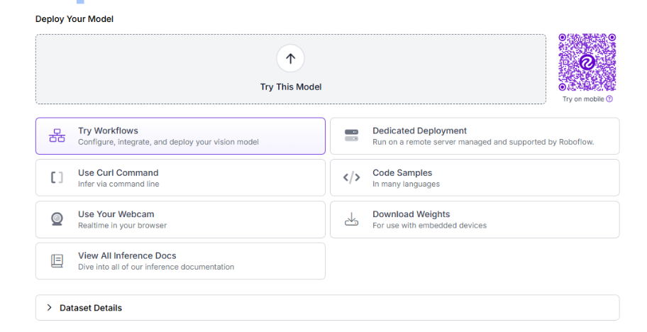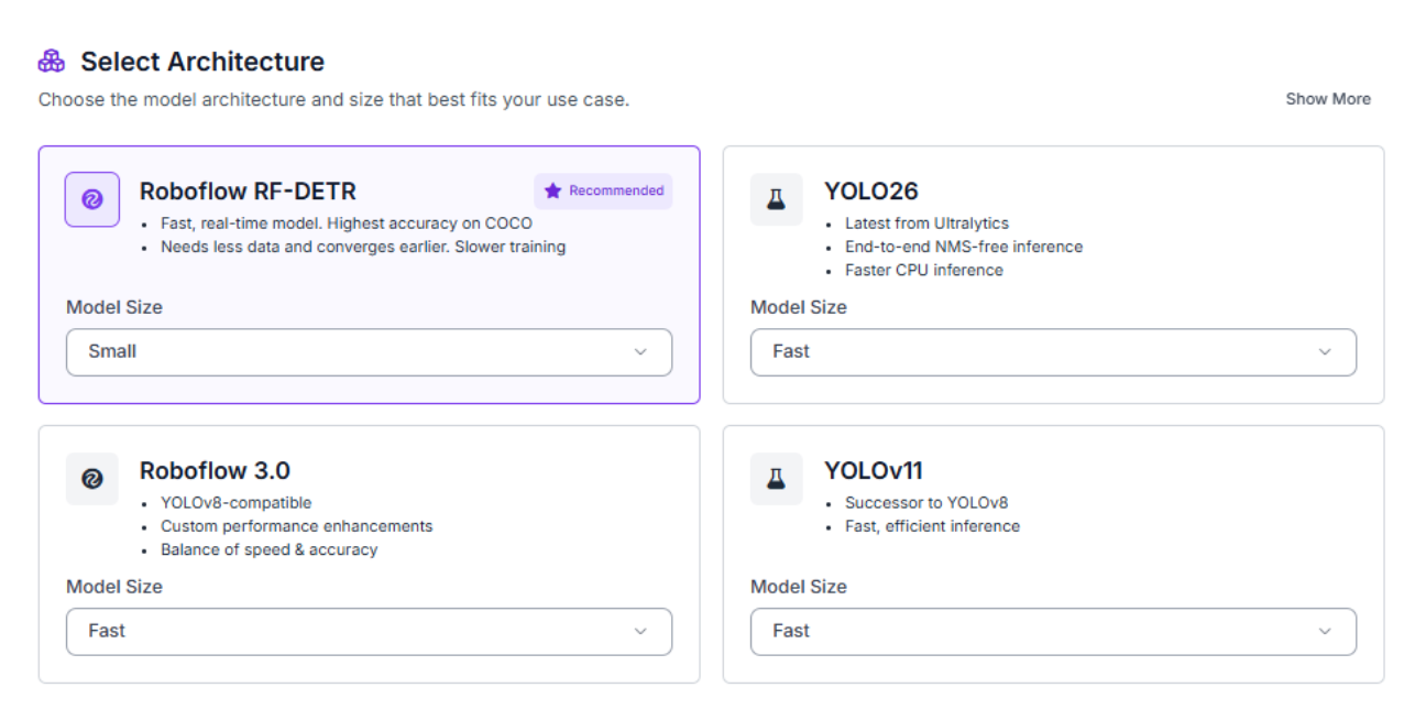 With your dataset version ready, click the "Train Model" button to configure your training job. Select RF-DETR as your model architecture, Roboflow's state-of-the-art object detection model that delivers exceptional accuracy while maintaining real-time inference speeds suitable for agricultural deployment.