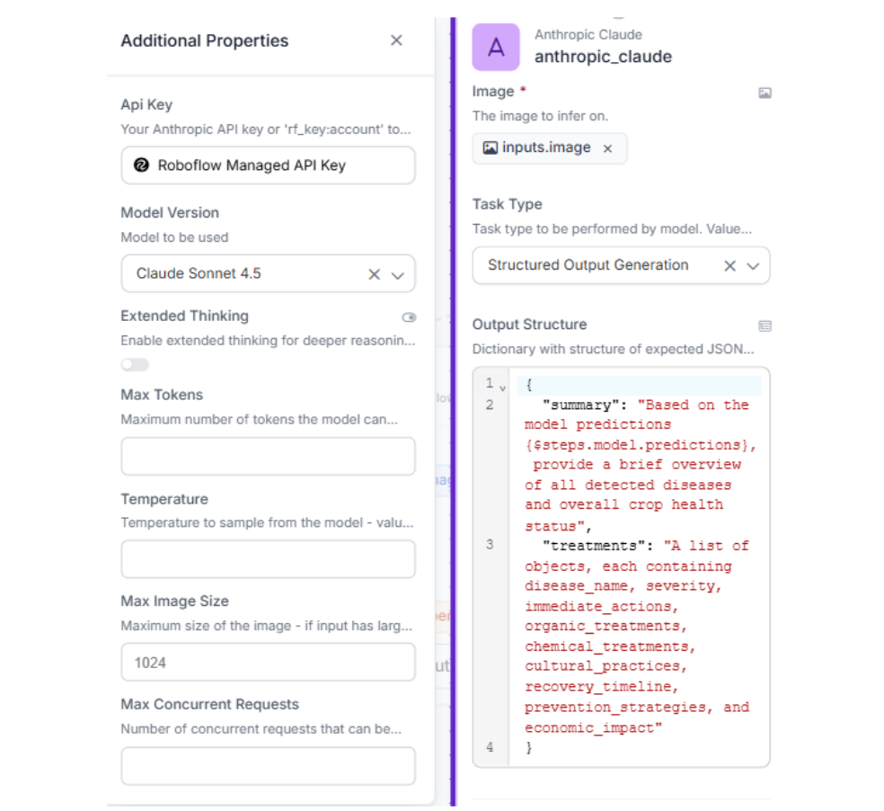 This configuration instructs Claude to analyze the model's disease predictions and generate comprehensive treatment plans with specific fields for severity assessment, organic and chemical treatment options, cultural practices, recovery timelines, prevention strategies, and economic impact analysis.