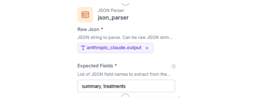 Configure the parser to accept the Claude VLM output as its input source, then specify these expected fields: summary, treatments. The parser will validate that Claude returns both the overall summary and the detailed treatments array, making the data ready for display or further processing.