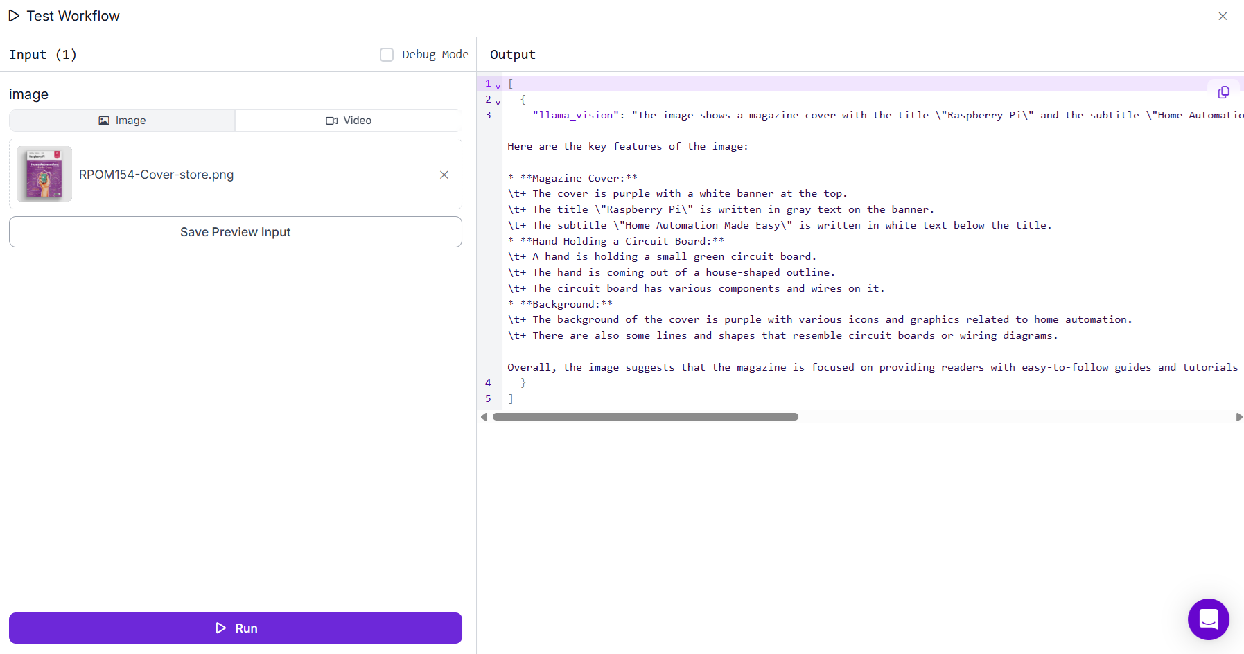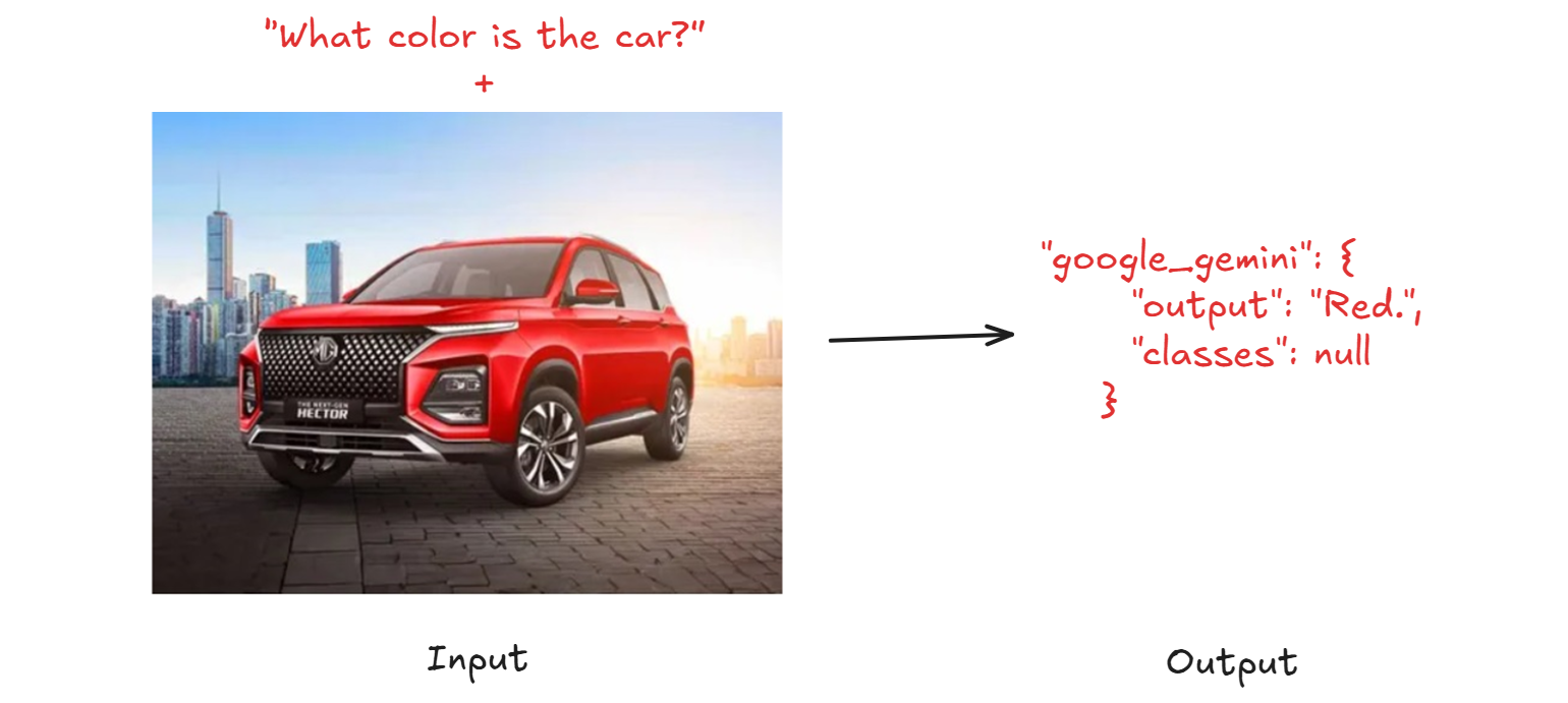 As shown in image below, when you run the workflow with image of a red car and question “What color is the car?” as input, you will see out “car”.