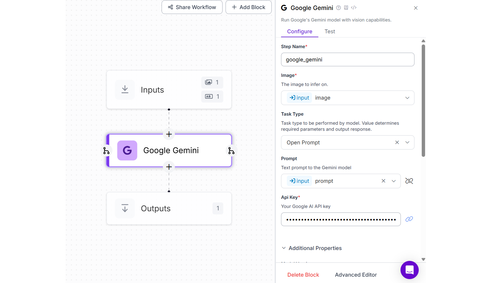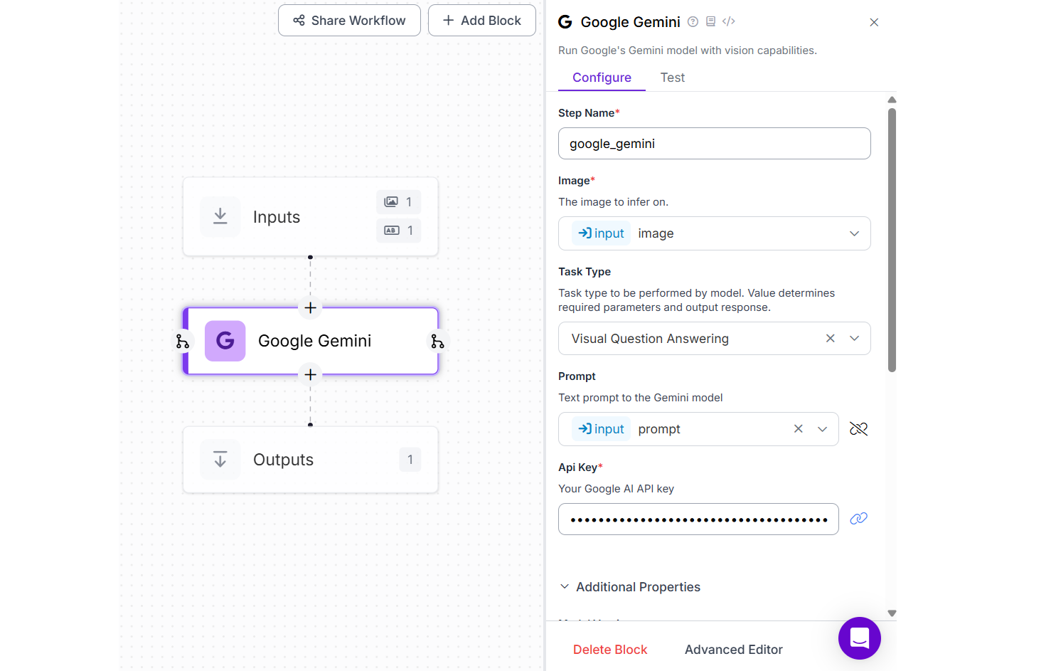 For this example, create a Roboflow Workflow with input block accepting image and a text prompt. Now add the Google Gemini Block and choose Task Type as “Visual Question Answering” and bind the Prompt property with the variable prompt that you specified in the input block.