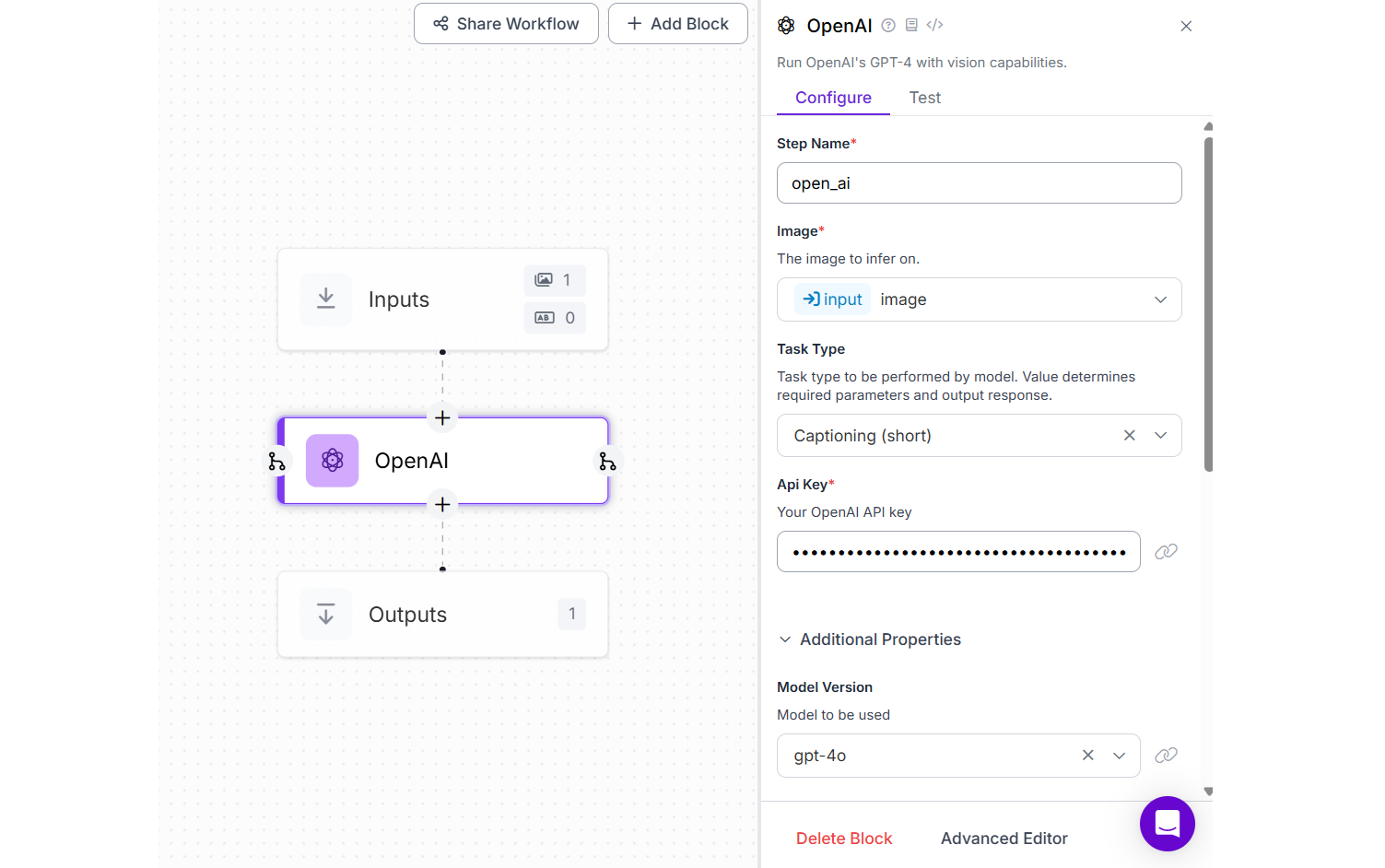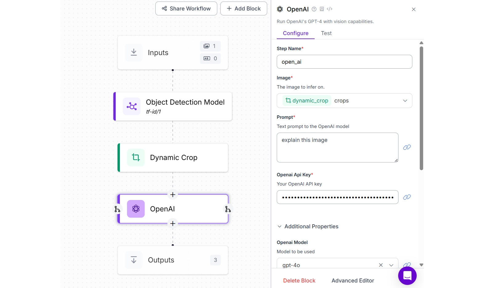 For this example, create a Roboflow Workflow by adding OpenAI block and choose the Model Version as “gpt-4o”.