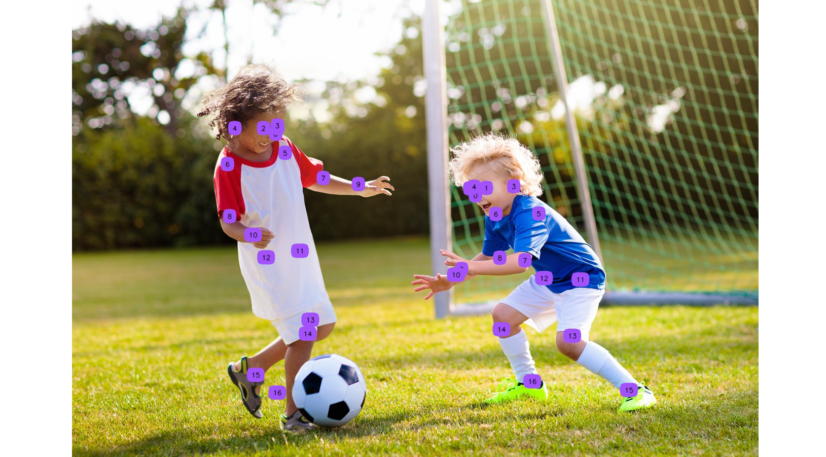 Keypoint detection involves identifying specific, meaningful points on an object or a person in an image, such as joints (elbows, knees) in human pose estimation or facial landmarks (eyes, nose, mouth). These points are used to understand the posture, orientation, or structure of the object. Keypoint detection is widely used in human activity recognition, fitness tracking, facial recognition, gesture control, and animation.