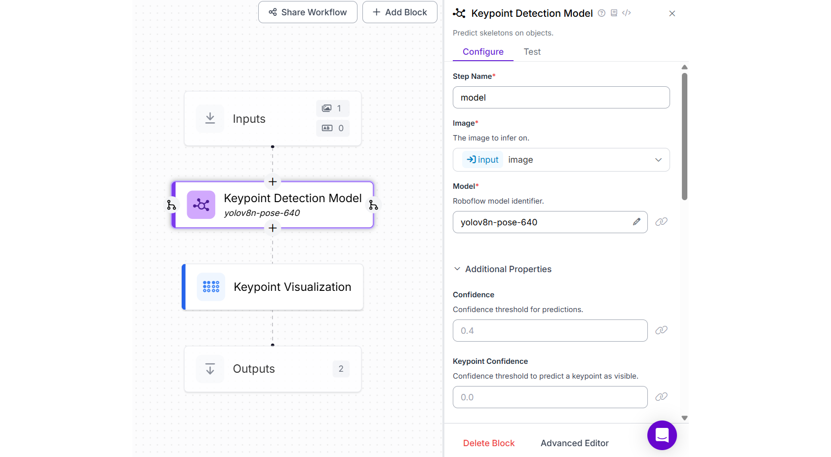 For this example, create a Workflow and add Keypoint Detection Block configured with YOLOv8 Nano Pose model from the available public models. After that add Keypoint Visualization Block and set the Annotator Type property to “vertex_label”.