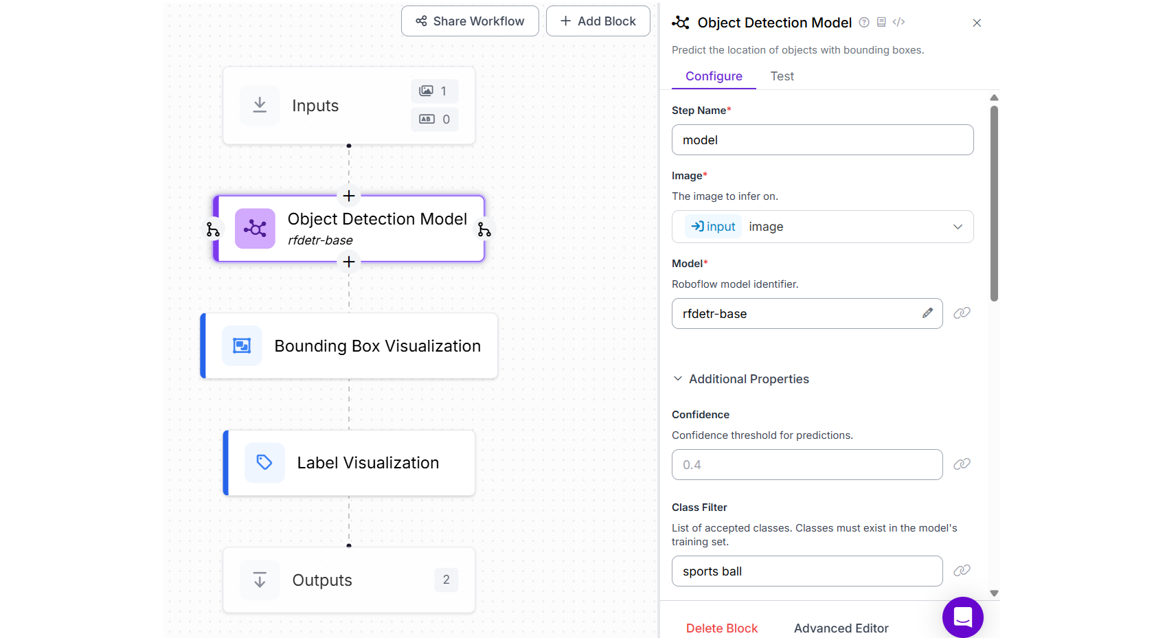 For this example we will utilize the same Workflow as above. Just change model to RF-DETR Base and set the class filter to “football” as this time we are detecting an object instead of people.