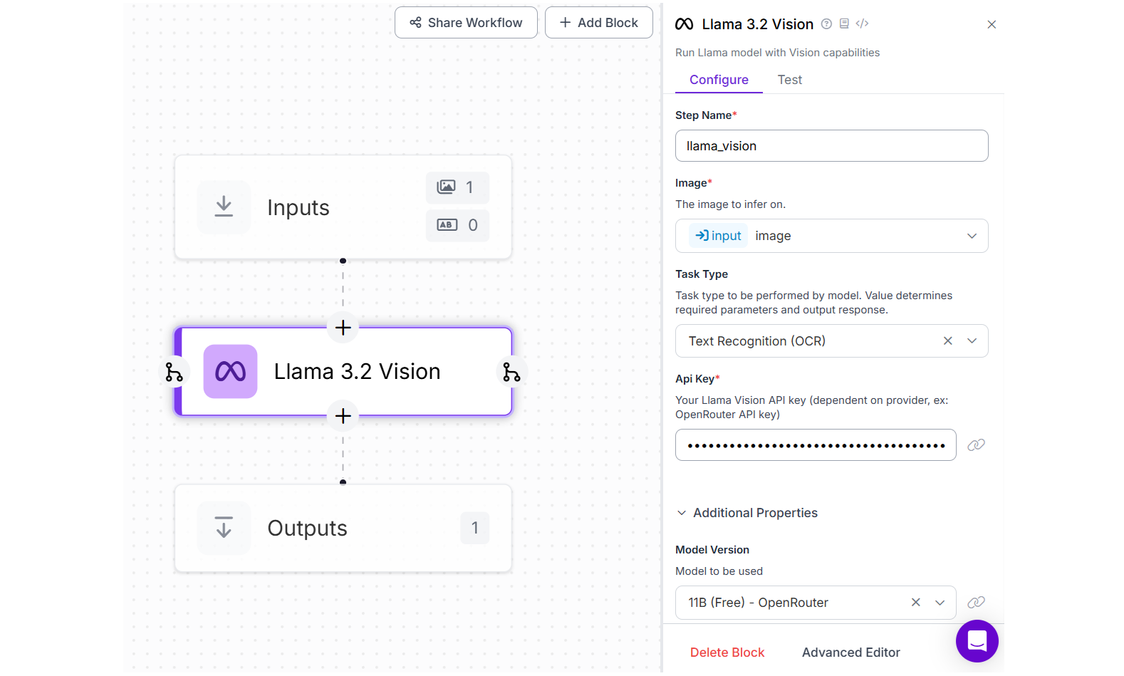 For this example we will use Llana 3.2 Vision model to extract text from images. Following the workflow with Llama 3.2 Vision configuration.