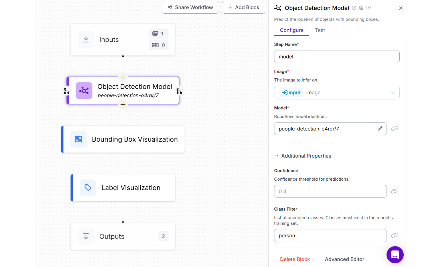For this example we will use People Detection model from Roboflow. Create a Roboflow workflow as following with the object detection block configured with people detection model and class filter as “person”. Also add Bounding Box Visualization and Label Visualization blocks. Your Workflow should look like following.