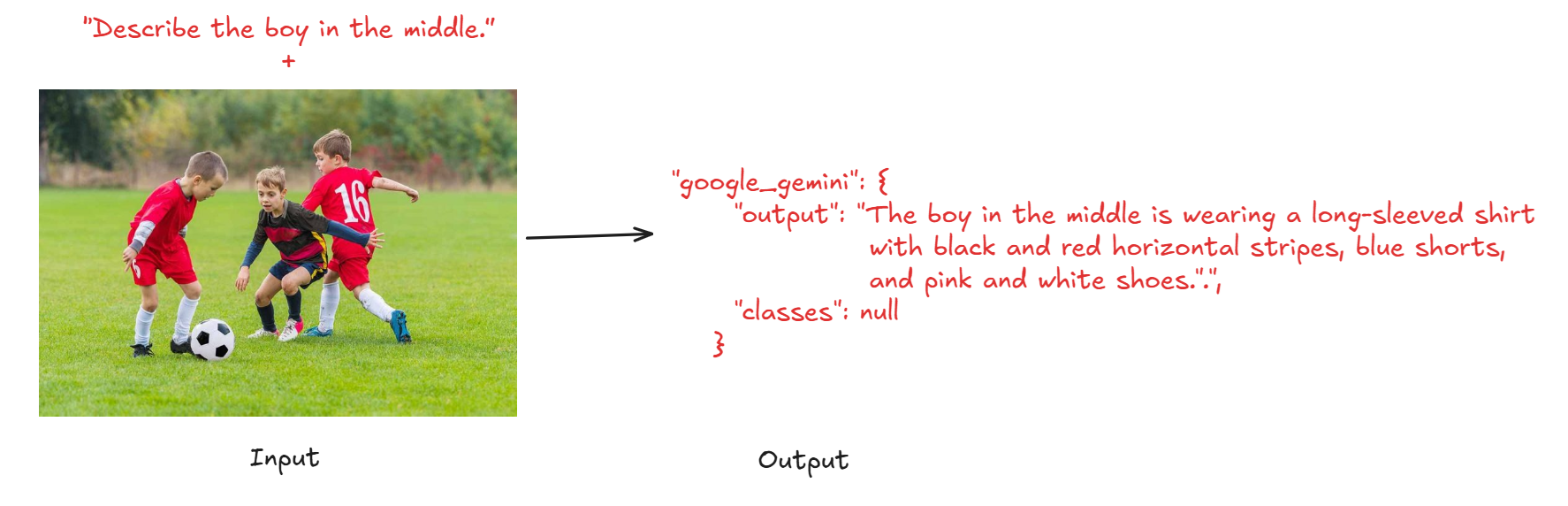 When you run the workflow with input image and a prompt “Describe the boy in the middle.” (left), you will see out “The boy in the middle is wearing a long-sleeved shirt with black and red horizontal stripes, blue shorts, and pink and white shoes.” (right).