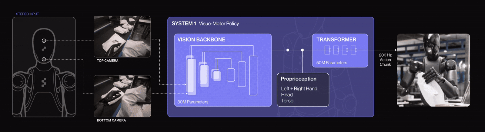 It is an 80-million-parameter visuomotor transformer running 200 times per second. This is the “fast reflex” system. It takes S2’s goal vector and translates it into smooth, real-time wrist, finger, head, and torso movements. It reacts continually to visual feedback to adjust motions as needed.