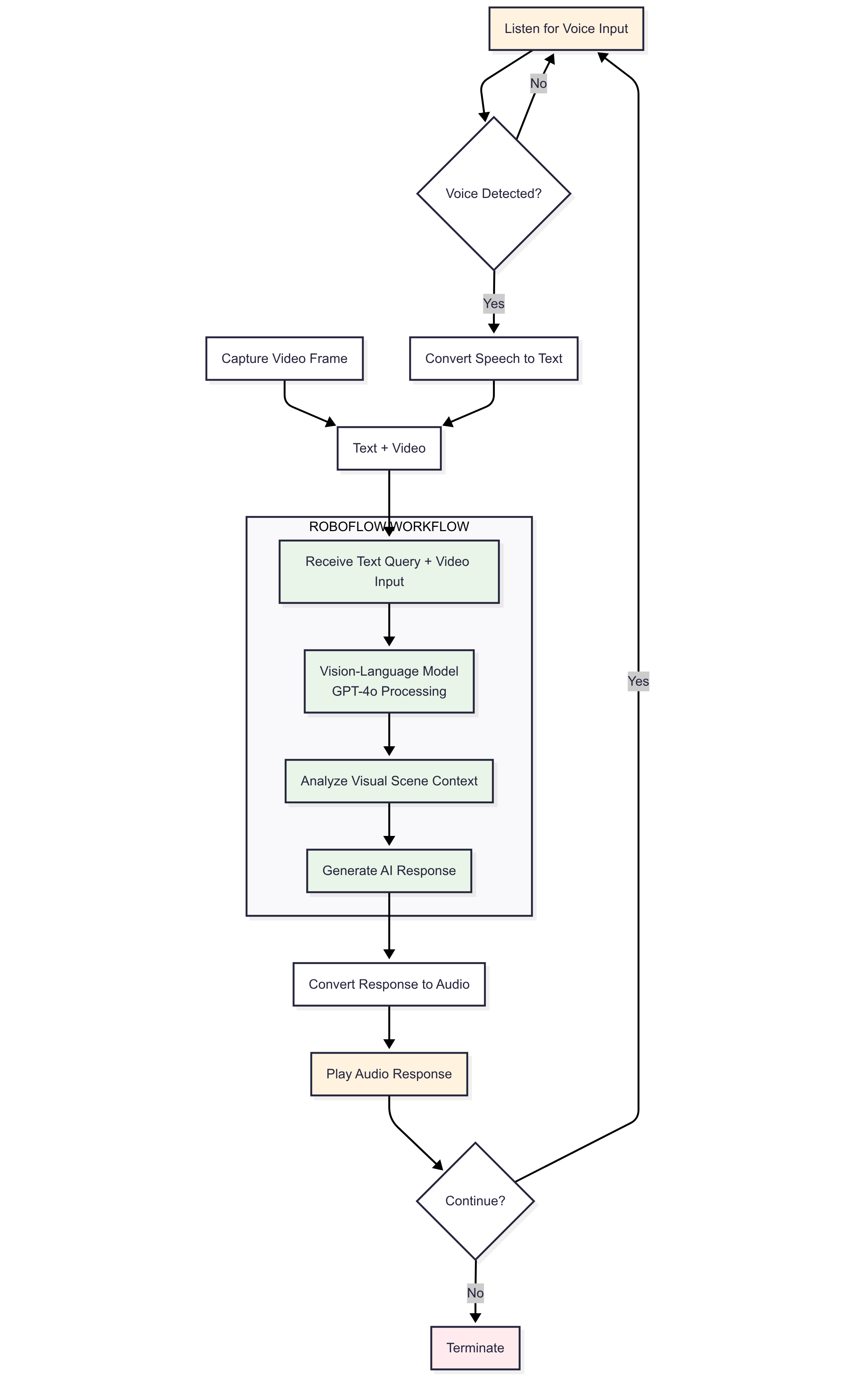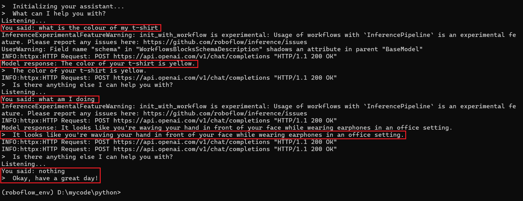 This Python script forms the backbone of a voice-interactive AI robot assistant powered by a Roboflow Workflow. Since the Roboflow Workflow expects a text prompt and image or video input, the script first uses the speech_recognition library to capture spoken commands from the user and convert them into text. This text prompt is then sent, along with a live video feed from the robot’s camera, to a Roboflow workflow that runs a vision-language model (like GPT-4o). Once the model processes the visual scene in context of the user’s query and generates a response, the script uses pyttsx3 to convert that response into audio feedback, enabling the robot to speak back to the user. The whole system runs in a loop, allowing continuous voice interaction, and intelligently handles follow-up questions or termination based on user input. This seamless integration of voice input, real-time vision, AI reasoning, and voice output makes the assistant a natural and responsive companion.