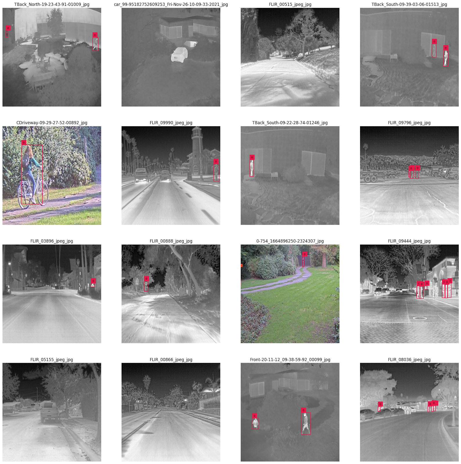 Figure 5.0 shows the results of inference on the people detection model. From the 16 images annotated by Grounding DINO, we can see that the “person” prompt was sufficient to identify people across the images. Grounding DINO was able to respond well to both thermal and color images in the dataset, drawing tight bounding boxes around all the people in the dataset.