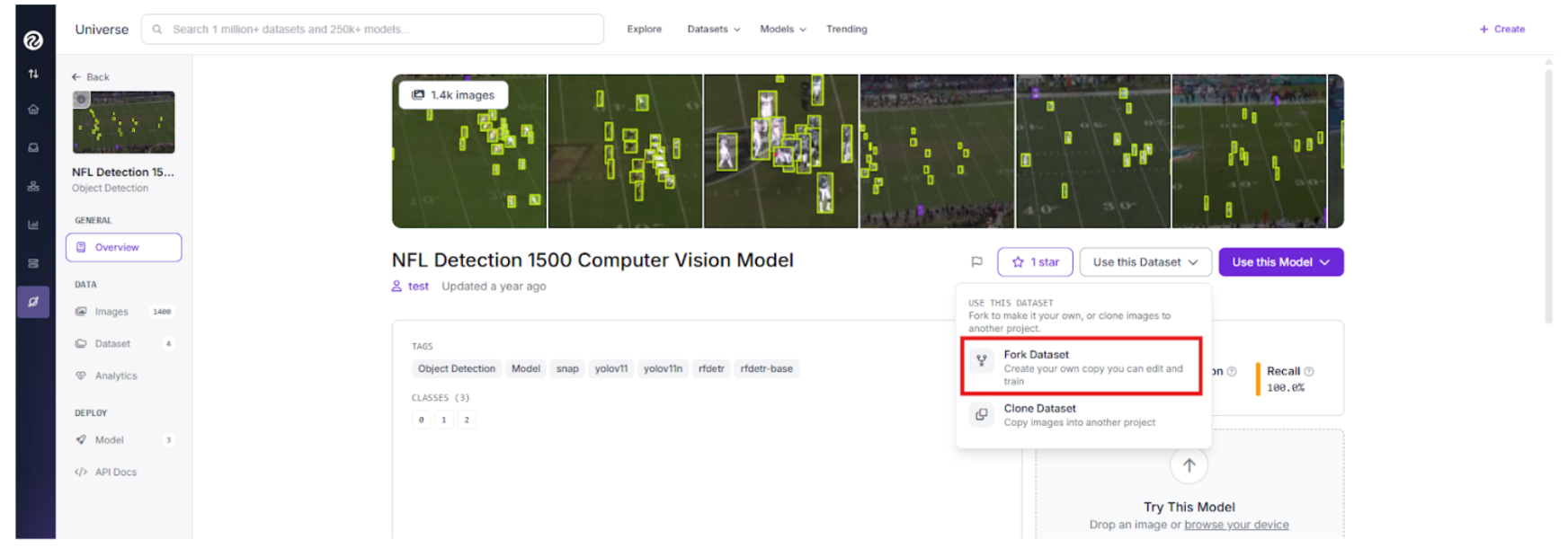 Search for a football tracking project on Universe and click "Fork Project" to pull the source imagery into your personal workspace for custom training.