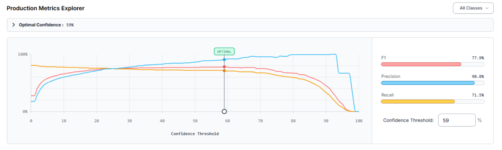 After training the RF-DETR model, we use the Production Metrics Explorer to audit the results. Our football detector achieved a mAP@50 of 74.8%. At an optimal confidence of 59%, the system reached an F1 Score of 77.9%.