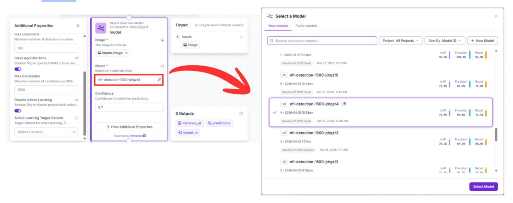 - Configuration: Select your trained model (nfl-detection-1500-jdrgz/4).