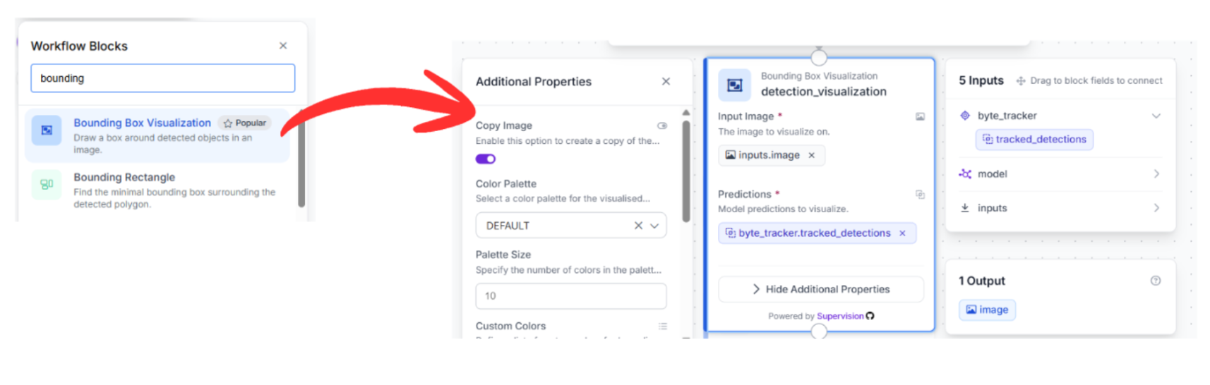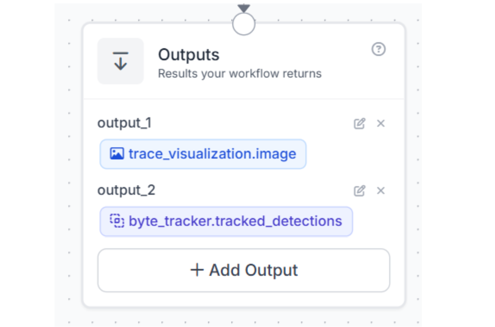 Drag the Output block onto the canvas. Connect your final visualizer (Trace Visualization) to this block. Then choose to get outputs from the bytetracker and trace_visualization blocks. This will return the finished, tracked video stream containing both the bounding boxes and the movement history.