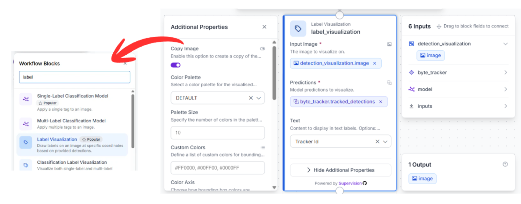 Label Visualization: Connect the previous visualizer to this block. This pulls the Track ID from the Byte Tracker and overlays the ID number onto the bounding box.