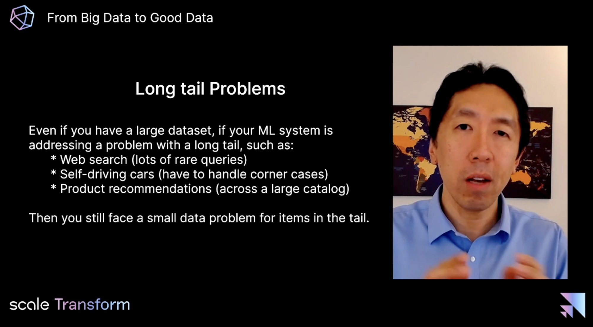 For most projects, Andrew says, the code is a solved problem; you can just download something from Github. But the data is not solved. Most domains do not have access to "big data" like consumer web companies do. And even for ones that do, you can break down "big data" machine learning problems into a collection of "small data" problems (for example, even though there is lots of driving data available, a self driving car model needs to perform well in edge cases like unicycles crossing the road).