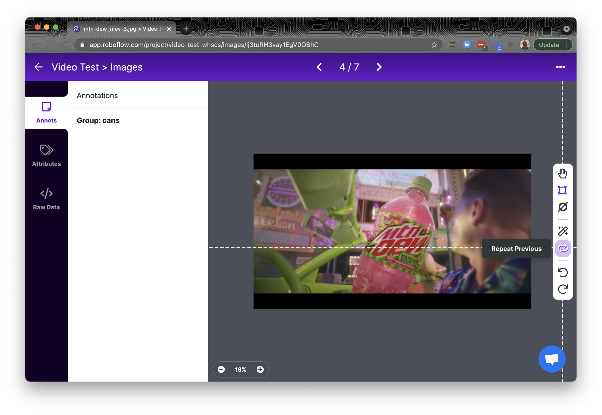The Repeat Previous tool will copy the annotation from the last image you annotated. Since the same objects often occur across multiple frames of video, this lets you easily track objects over time by slightly modifying your previous annotation instead of having to start from scratch.
