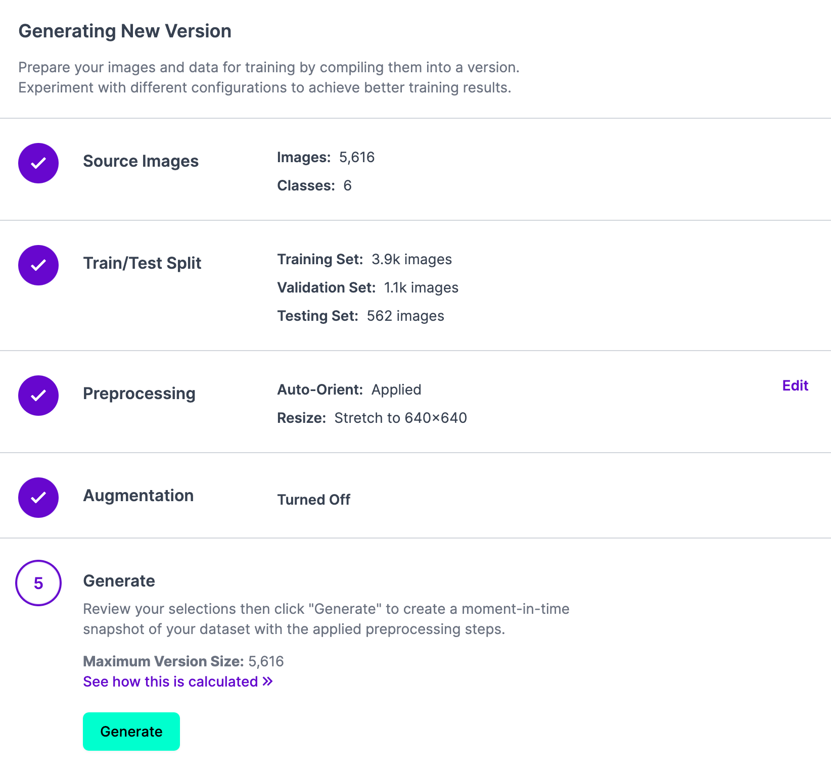 To do so, first create a new project in Roboflow and upload the data on which your model was trained. Then, click "Generate" in the Roboflow dashboard to create a new project version with which you will attach your weights: