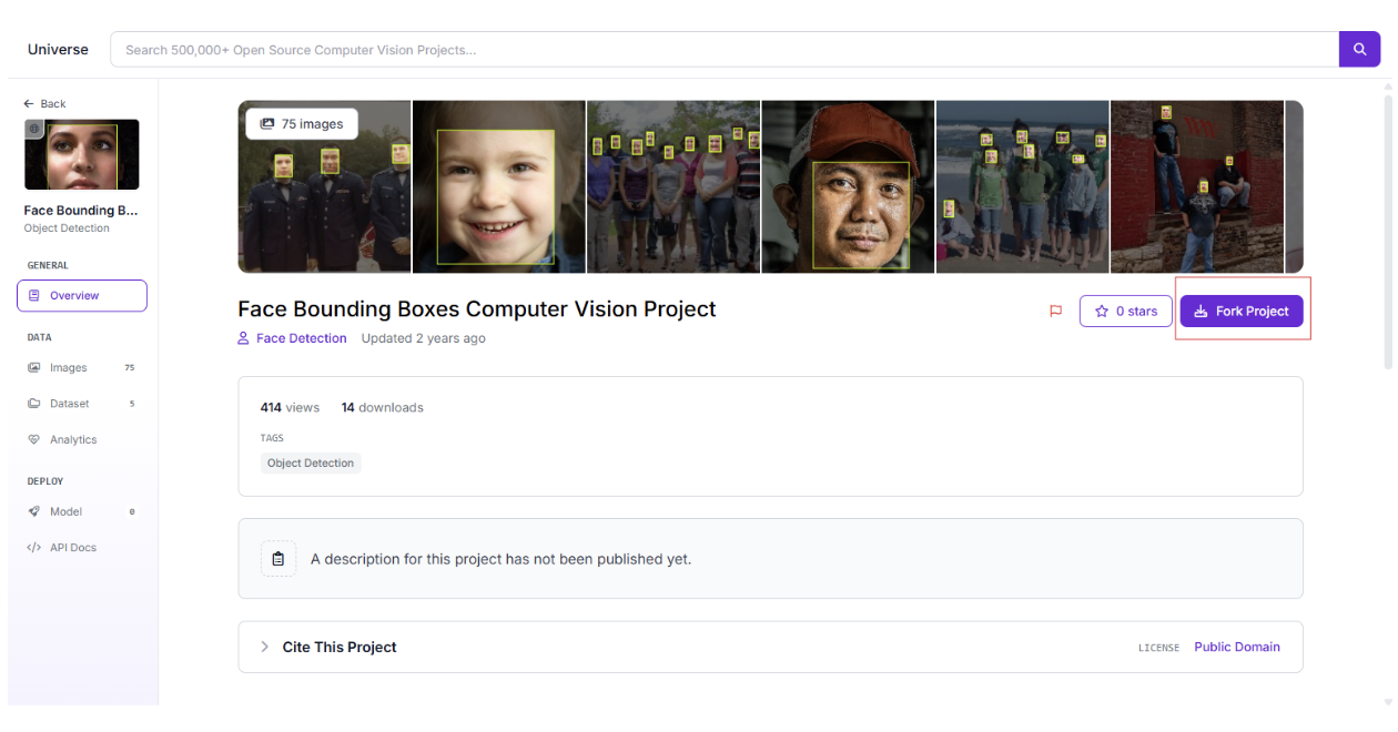 First up, we need to figure out where people are in the photo to tag whether the subject is centred, off-centre, or awkwardly cropped. We can start with the Face Bounding Boxes Dataset from Roboflow Universe, which is great for detecting faces. To use it, I forked the project into my workspace with a single click, super easy, and you can do the same by hitting the “Fork” button on Roboflow and selecting your workspace.