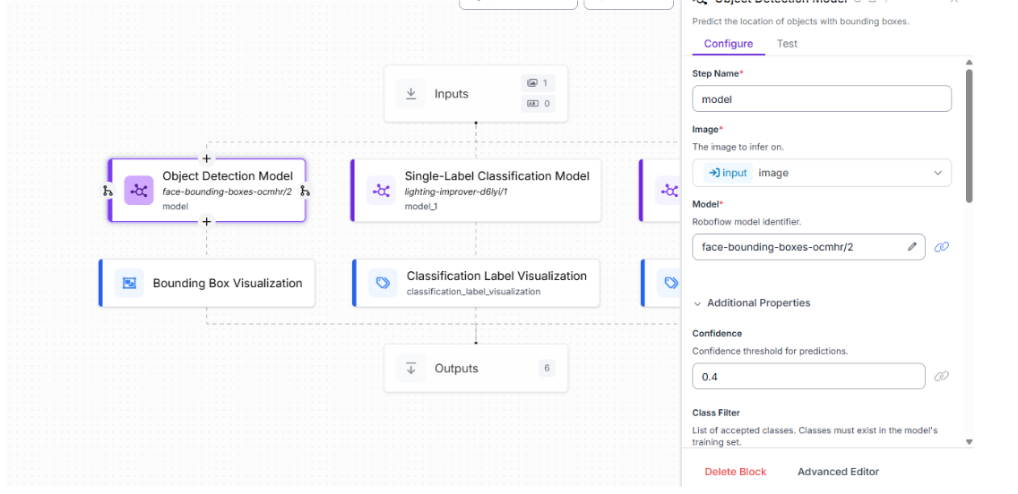 For the first face detection model and its corresponding Label Visualization block, we can keep the default settings: