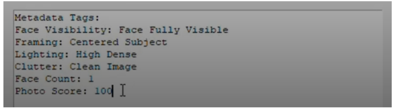 With the models trained and workflow configured, we can build a Python application using Tkinter for a user-friendly GUI, Pillow for image handling, and inference_sdk for Roboflow API integration. The app will let users upload images, process them through the workflow, embed metadata (face visibility, framing, lighting, clutter, face count, and photo score) into the image file, and view the results. Use this GitHub repository for access to this code. Here’s how it works:
