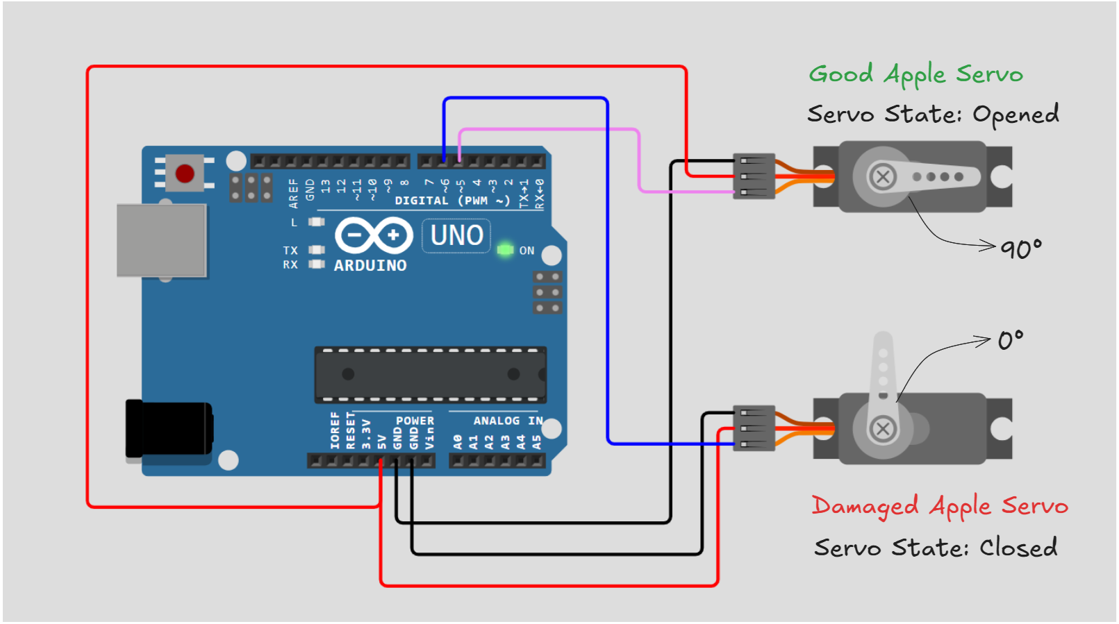 Two servos are connected to an Arduino Uno, each responsible for controlling a sorting path. The Good Apple Servo operates the path for apples classified as "good," while the Damaged Apple Servo manages the path for damaged apples.