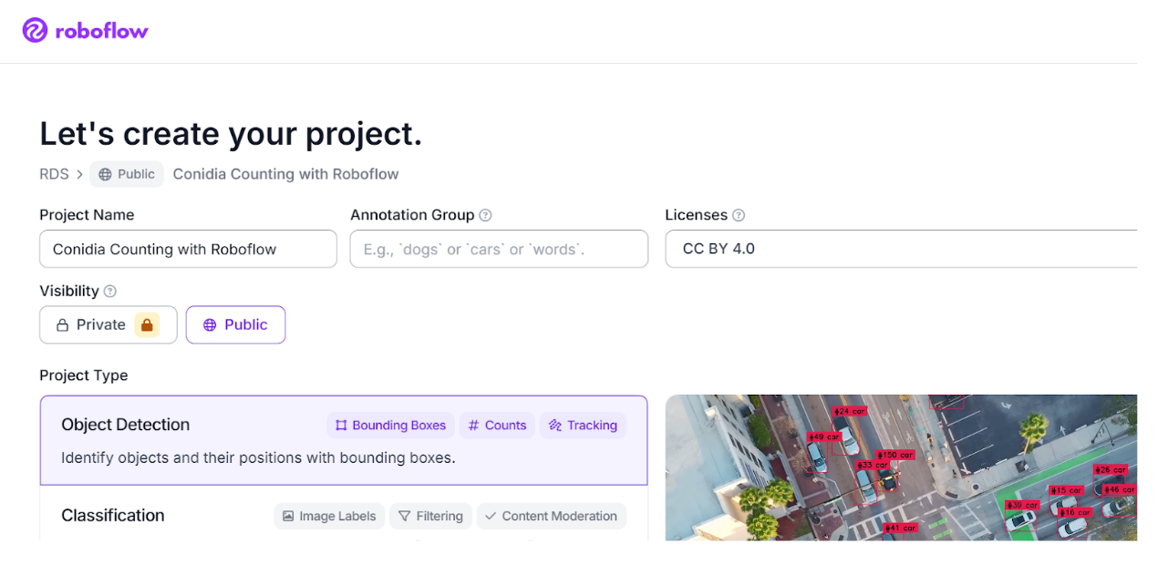 Start by creating a new project in your Roboflow dashboard. To automate counting, select Object Detection as your project type. Define your project settings, including a clear naming convention and visibility, to establish the digital foundation for your microscopy dataset.