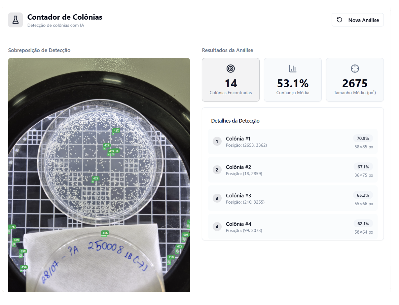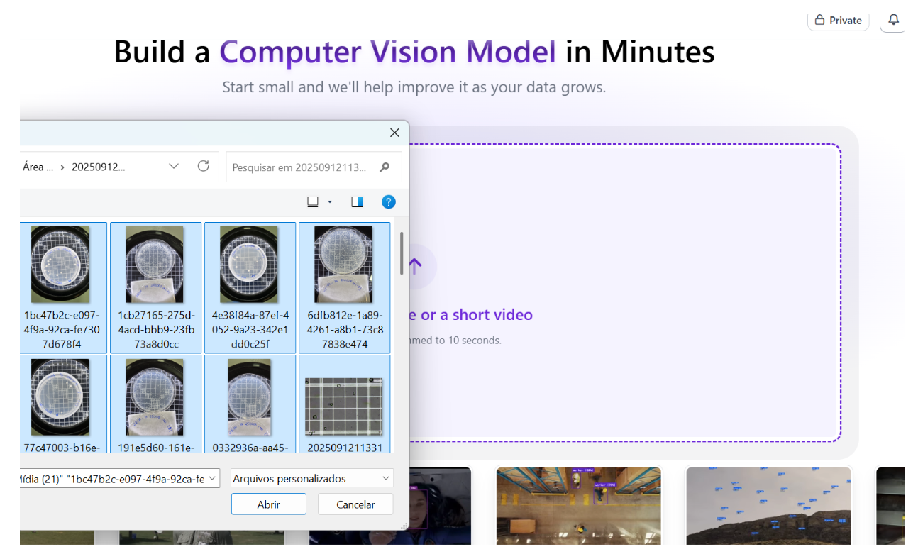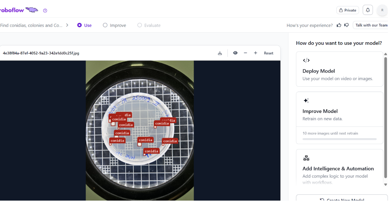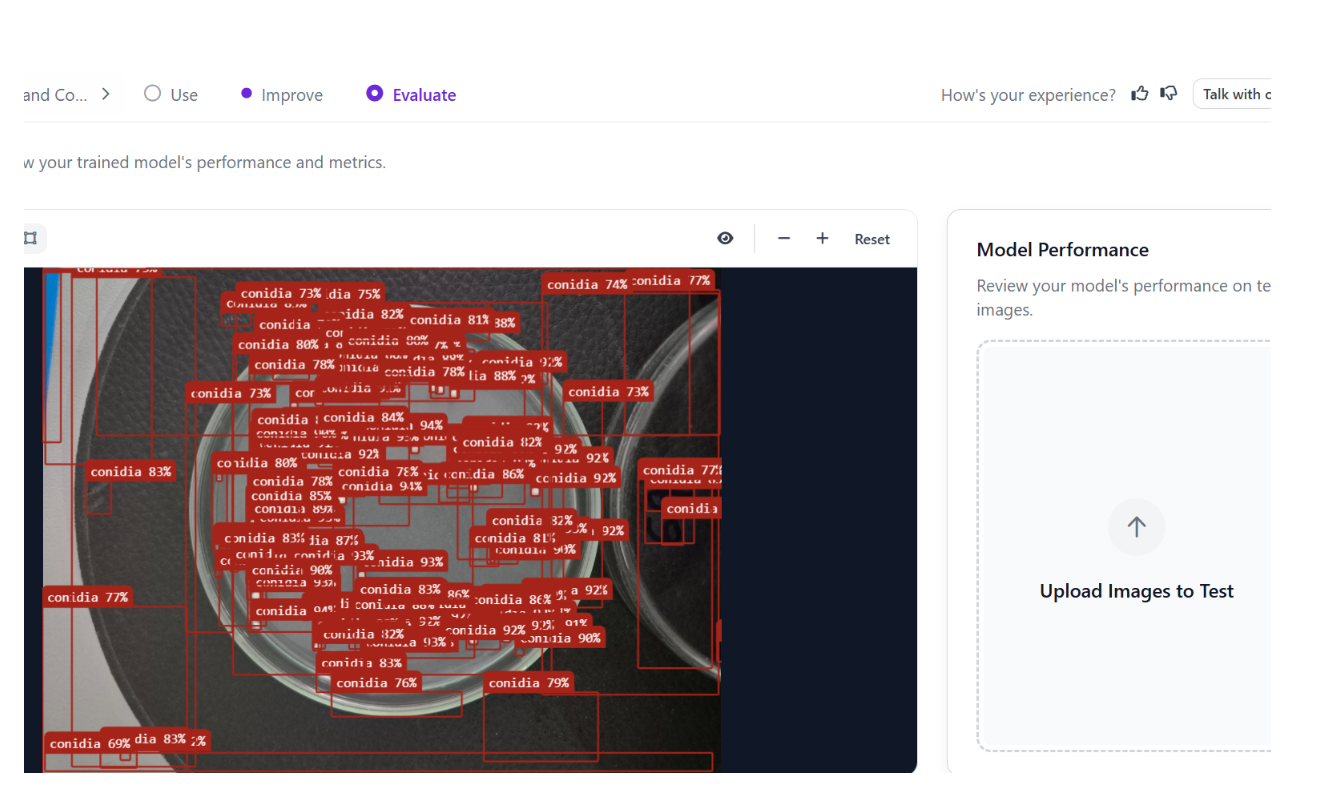 After capturing the images, they are uploaded into our artificial intelligence solution, developed using Lovable and powered by Roboflow. This integrated environment allows us to process the images efficiently, leveraging trained computer vision models specifically designed to identify and count conidia with high accuracy. The automation at this stage significantly reduces the need for manual intervention and accelerates the overall workflow.