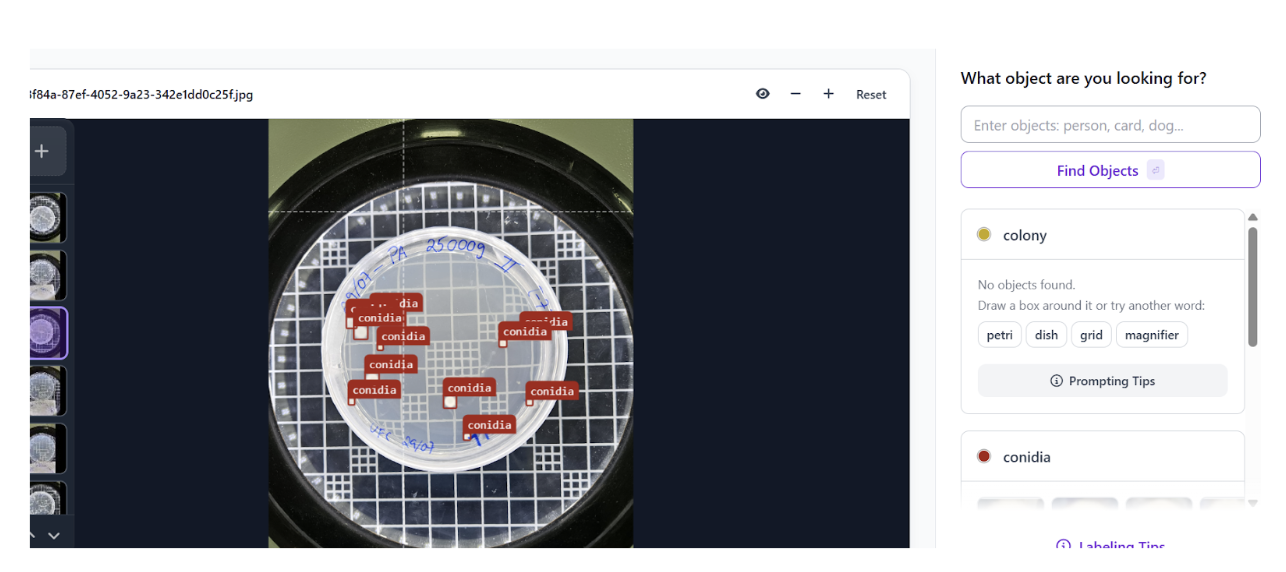 Label each target object, identifying every individual conidia, to teach the model exactly what to prioritize and what to ignore as background noise. Once labeled, perform a high-level review to ensure absolute consistency across your dataset. Standardizing your labels now is the best defense against model drift and ensures the highest possible mAP once you choose to train.