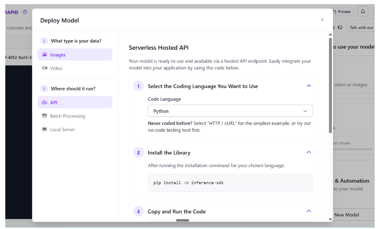 Now, select "Review model" to let Roboflow’s managed infrastructure handle the heavy lifting. After training completes, deploy your model instantly as a hosted API endpoint or a local edge container to start counting conidia in production with a single line of code.
