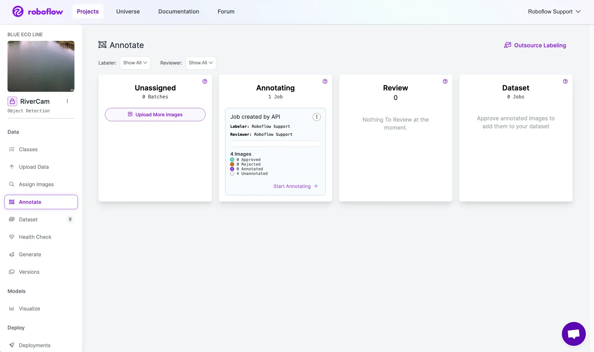 Once the images are added to Roboflow for labeling, they will show up as a Job in the Annotate dashboard. Image labeling can be done by multiple people and move through an approval workflow to ensure only high quality data is added to the Dataset.