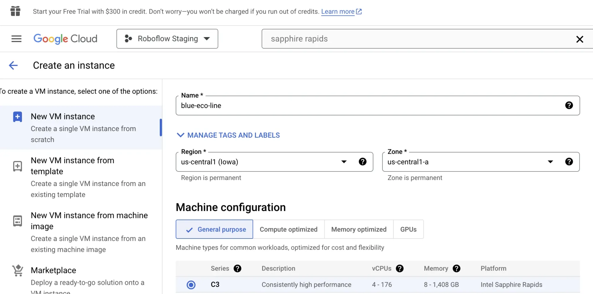 Create an C3 VM instance using GCP to access the machine for model training.