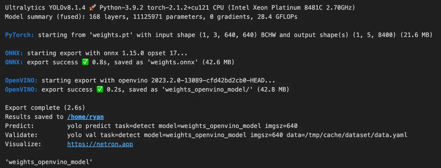 ov_model = YOLO('weights_openvino_model/')Once this is successful, you will see logs of a successful conversion and export of the model on Sapphire Rapids.