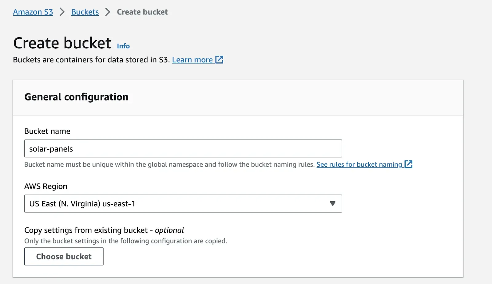 To get started, search for “S3” in the AWS search bar and create a bucket. Choose a name and region in which your bucket should be deployed.