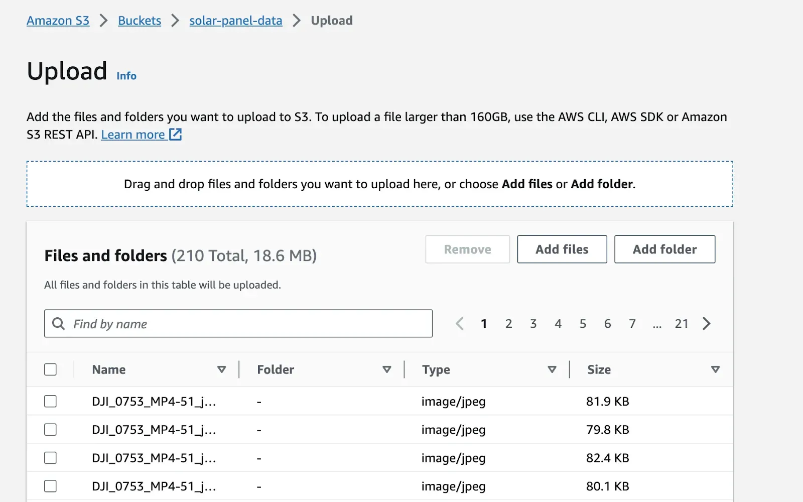 Drag and drop the files or folders you want to upload into S3. A list of files pending upload will appear in the “Files and folder” section.