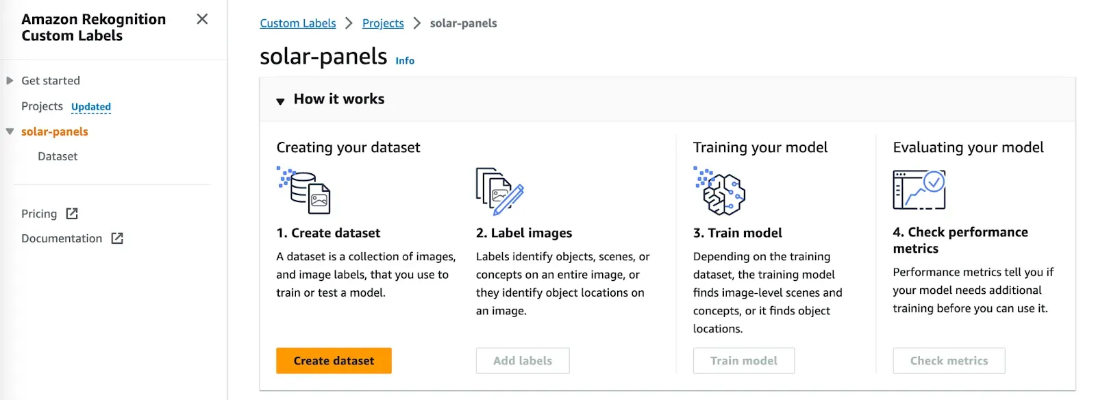 Open your project in AWS Rekognition Custom Labels. A panel will appear showing the four steps you need to complete to train and evaluate a model: