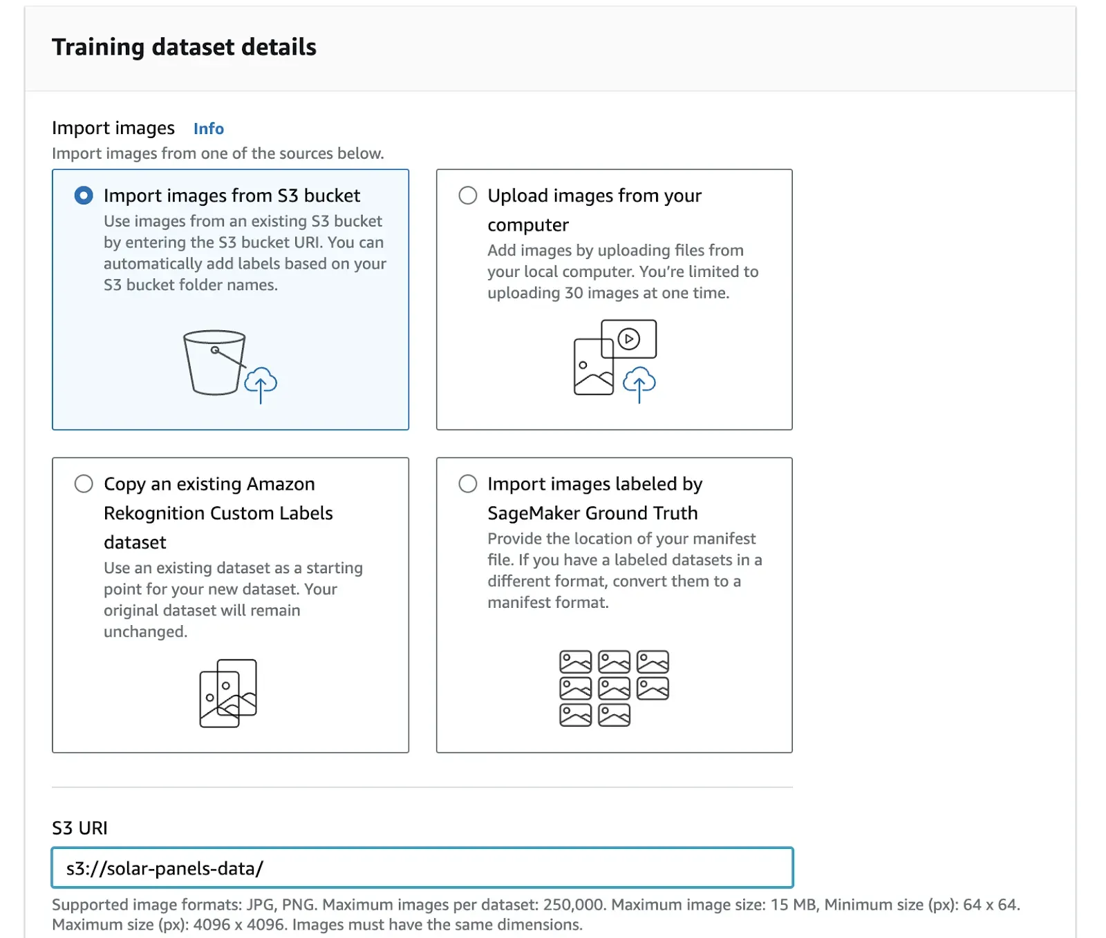 In the S3 URI option, paste in the URI of the folder in which you saved the images in your S3 bucket. In this example, the URI is s3://solar-panels-data/.
